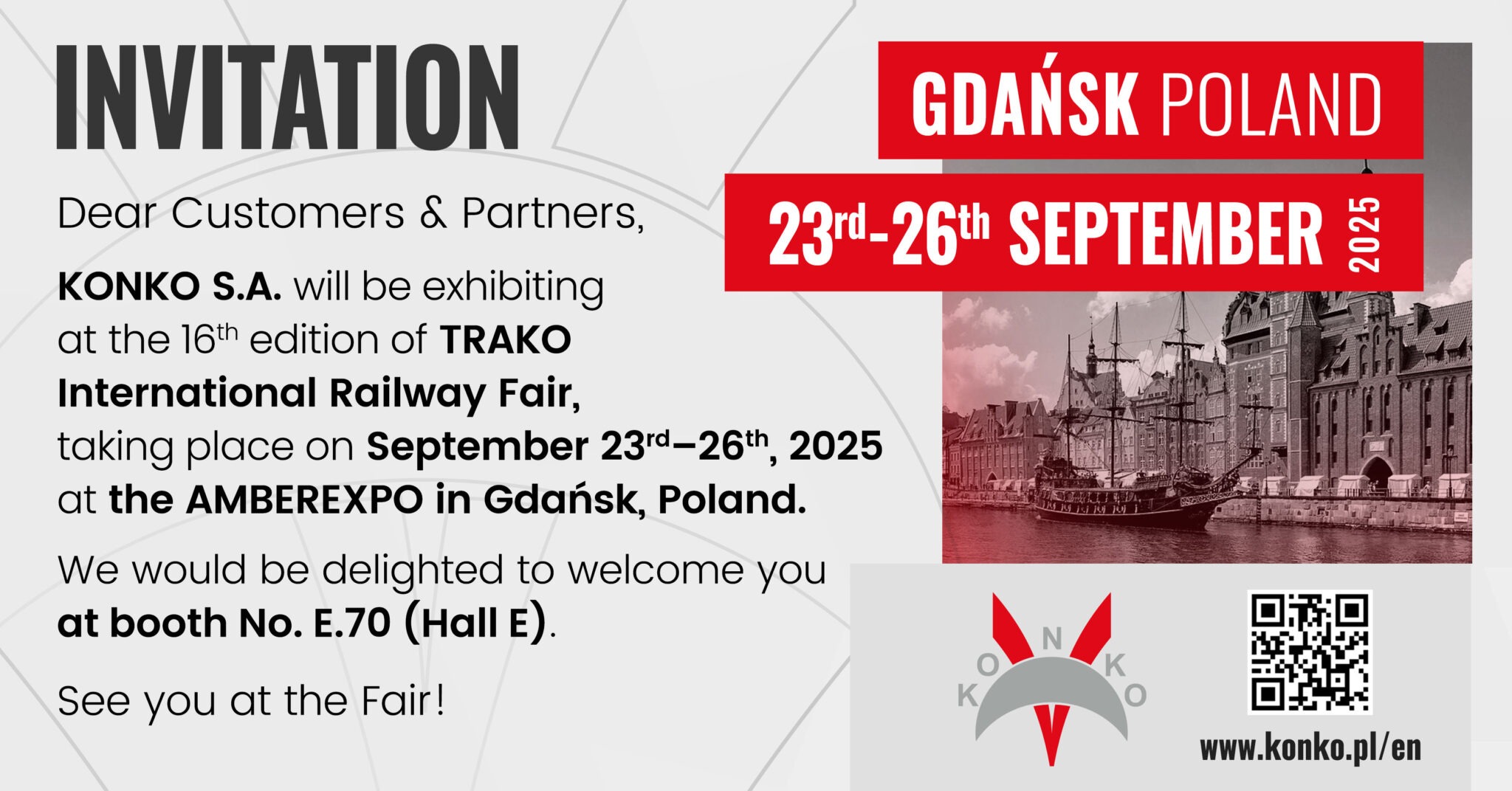 Dear Customers & Partners, KONKO S.A. will be exhibiting at the 16th edition of TRAKO International Railway Fair, taking place on September 23rd–26th, 2025, at the AMBEREXPO in Gdansk, Poland. We would...